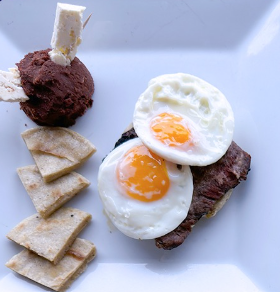 Clásico desayuno que incluye huevos estrellados, carne asada, frijoles refritos y plátanos, una opción rica en sabor y tradición.