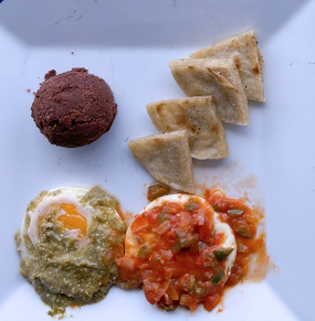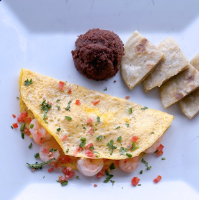 Una combinación de huevos, frijoles, plátanos fritos y tortillas, para saborear la auténtica gastronomía local.Omelette con guarniciones frescas